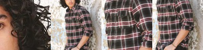 - Tartan plaid and contrast color chambray trim